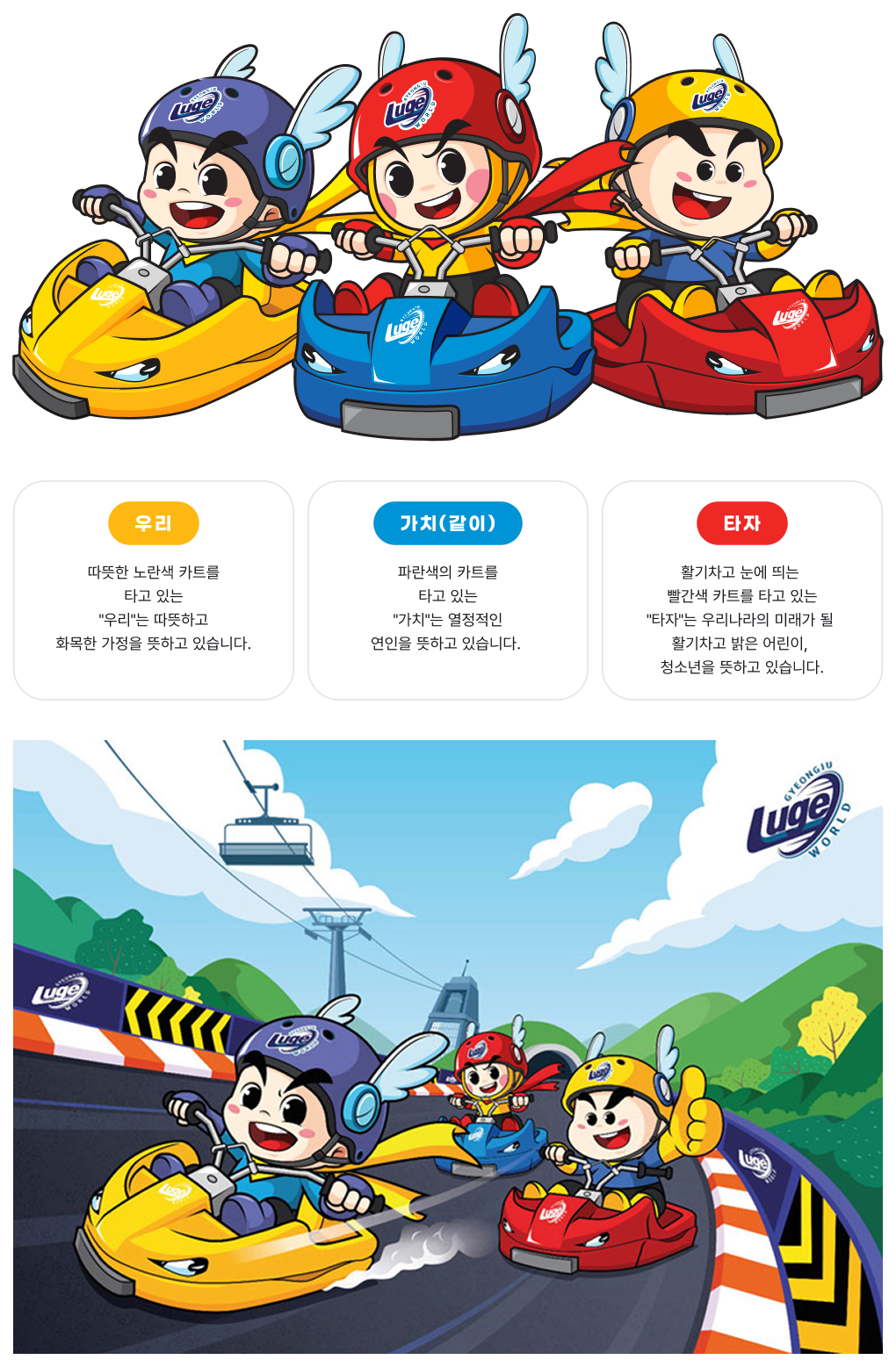 각 캐릭터의 이미지와 루지월드를 찾아주시는 방문객분들의 이미지를 결합하여 캐릭터를 개발했습니다.